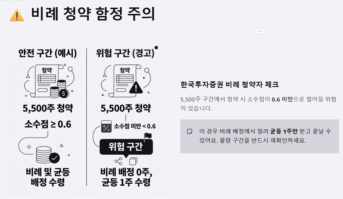 한국투자증권에서 비례 배정을 노리시는 분들 중 5,500주 청약 구간은 소수점이 0.6 미만으로 떨어질 위험이 있습니다. 이 경우 비례 배정에서 밀려 '균등 1주'만 받고 끝날 수 있으니 주의가 필요해요.