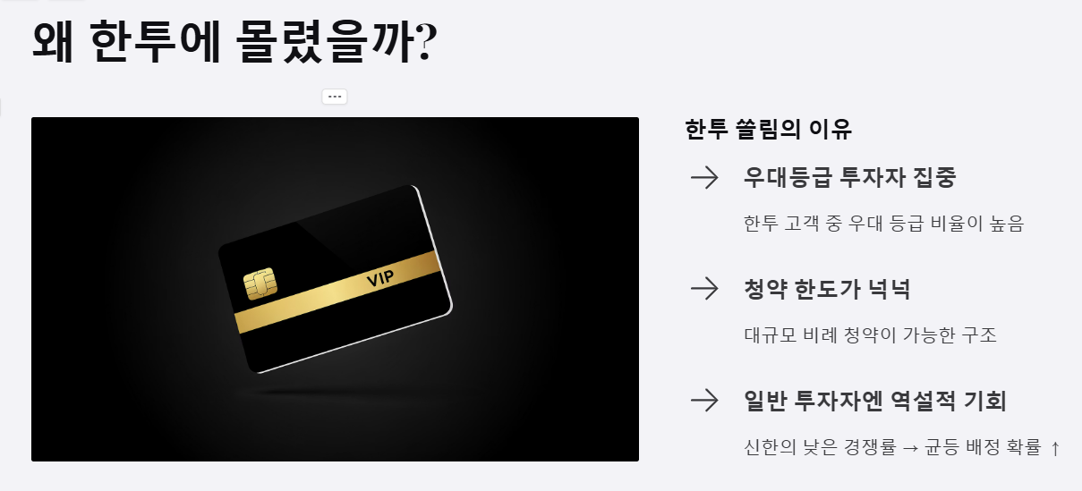 | 일반등급 투자자 | 신한투자증권 | 한투 대비 낮은 경쟁률로 균등/비례 확률 상승 |
