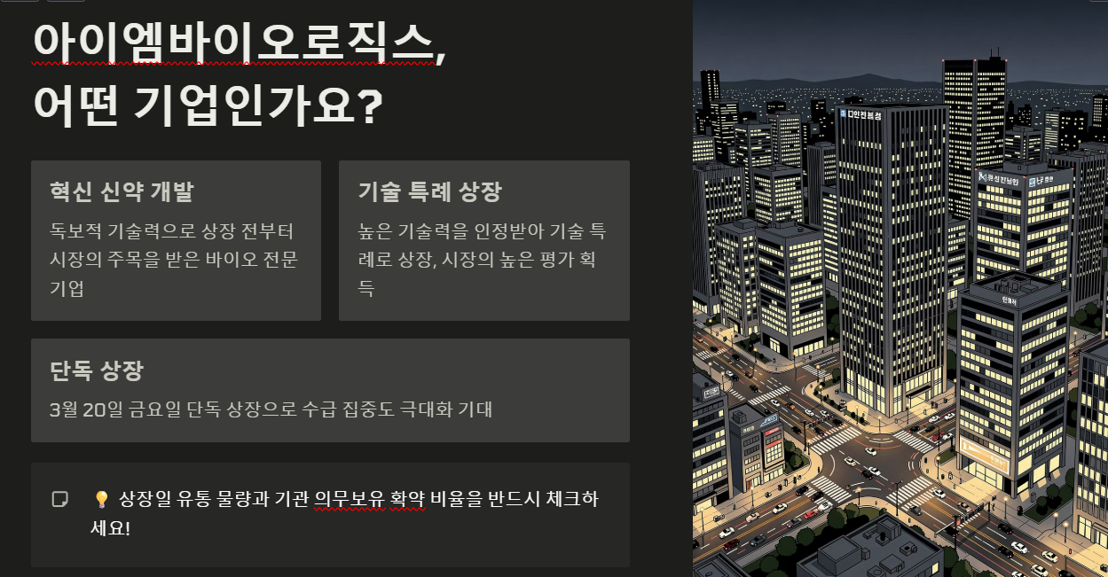 아이엠바이오로직스는 혁신적인 바이오 신약 개발 전문 기업입니다. 상장 전부터 독보적인 기술력으로 주목받았는데요. 특히 이번 상장은 단독 상장으로 예정되어 있어 수급 집중도가 높을 것으로 기대됩니다. 3월 20일 금요일, 우리 모두의 계좌에 '따따블'의 기적이 일어나길 바라며 기본 정보를 살펴볼까요?