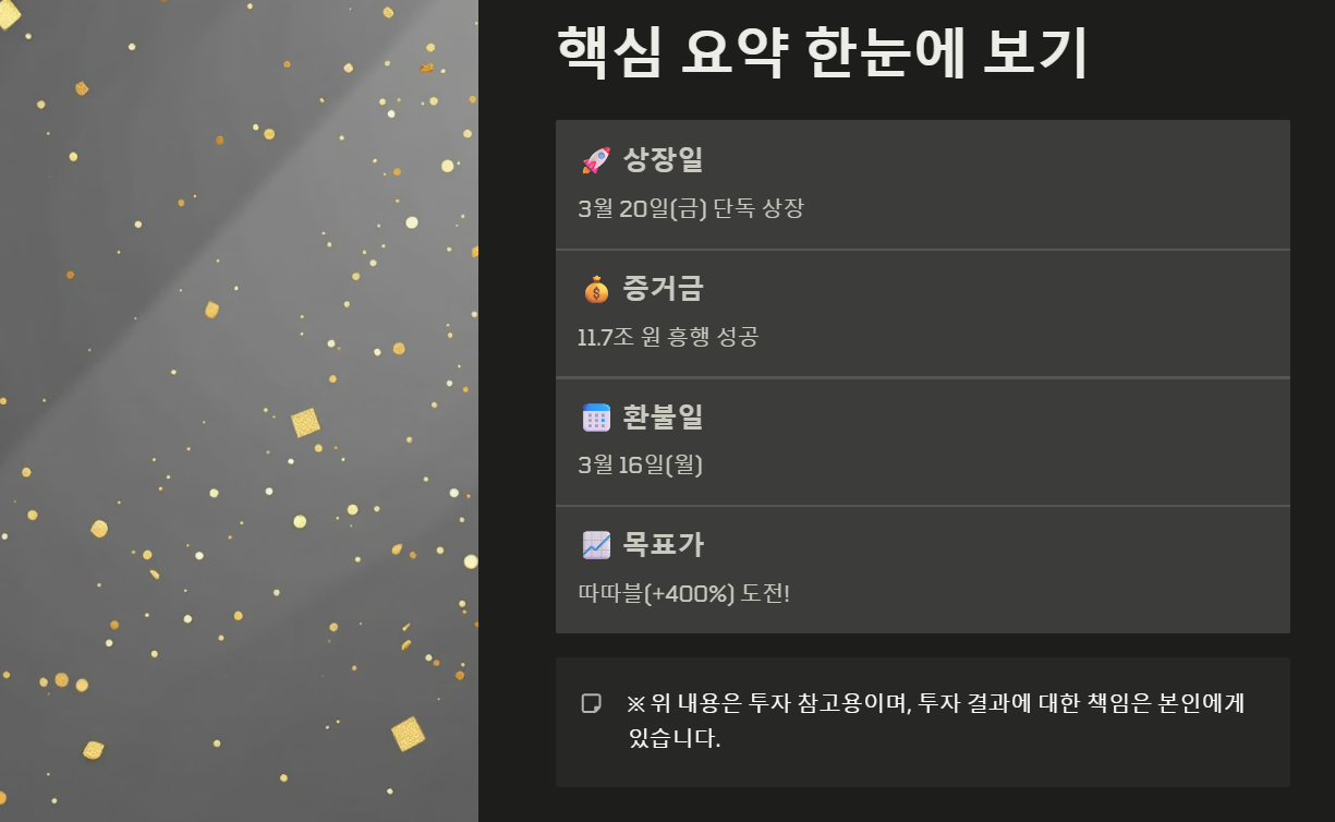 - 상장일: 3월 20일 금요일 단독 상장 예정입니다.