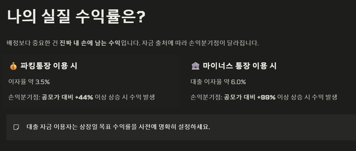 공모주 투자는 배정받는 것도 중요하지만, 대출 이자나 파킹통장 기회비용을 뺀 '실질 수익'이 얼마인지 아는 것이 더 중요하죠. 아이엠바이오로직스의 손익분기점을 간단히 확인해보세요.