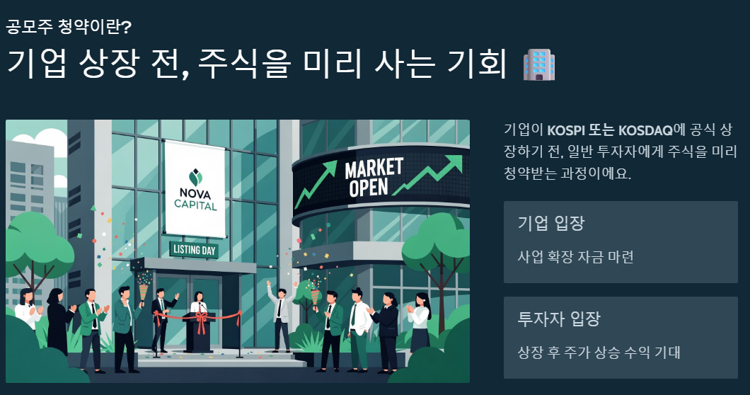 공모주 청약은 쉽게 말해 기업이 주식 시장(KOSPI 또는 KOSDAQ)에 정식으로 이름을 올리기 전에, 일반인들에게 "우리 주식 미리 살 사람?" 하고 신청을 받는 과정이에요. 기업은 사업 확장을 위한 자금을 마련해서 좋고, 우리 같은 투자자는 상장 후 주가 상승을 통한 수익을 기대할 수 있어 매력적이죠.