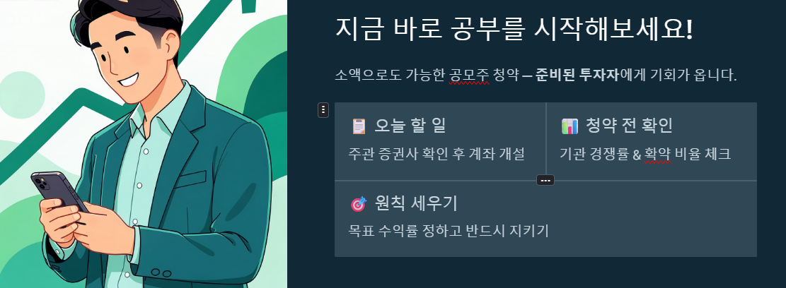 일부 증권사는 청약 시작 전날까지만 계좌를 만들어야 참여할 수 있는 경우가 많아요. 당일 개설은 안 될 수도 있으니 며칠 전 미리미리 준비합시다!